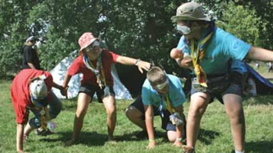Activity leaders wind lines of hand-holding, blindfolded scouts between tree trunks and guy ropes as they try to cross the border at night. Scouts must then decipher forms in a nonsensical script and negotiate with temperamental and disinterested border officials to get all their family members, even the 'sick' and 'injured', through to under-resourced camps on the other side.