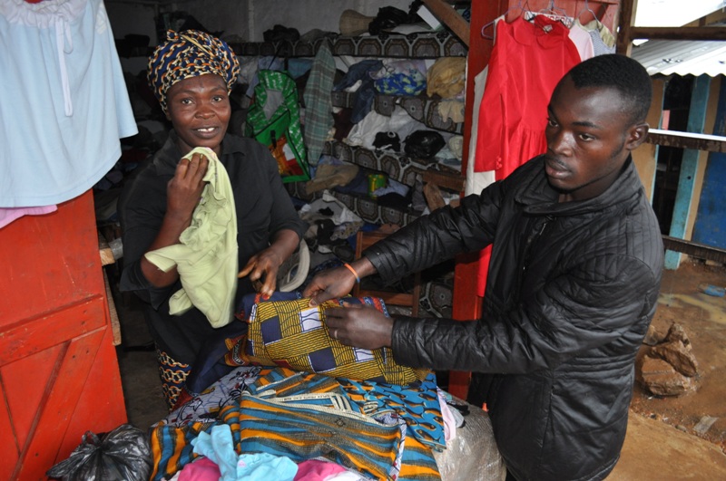 Refugee returnee Roseline Teah with a customer in her clothes shop in Liberia.