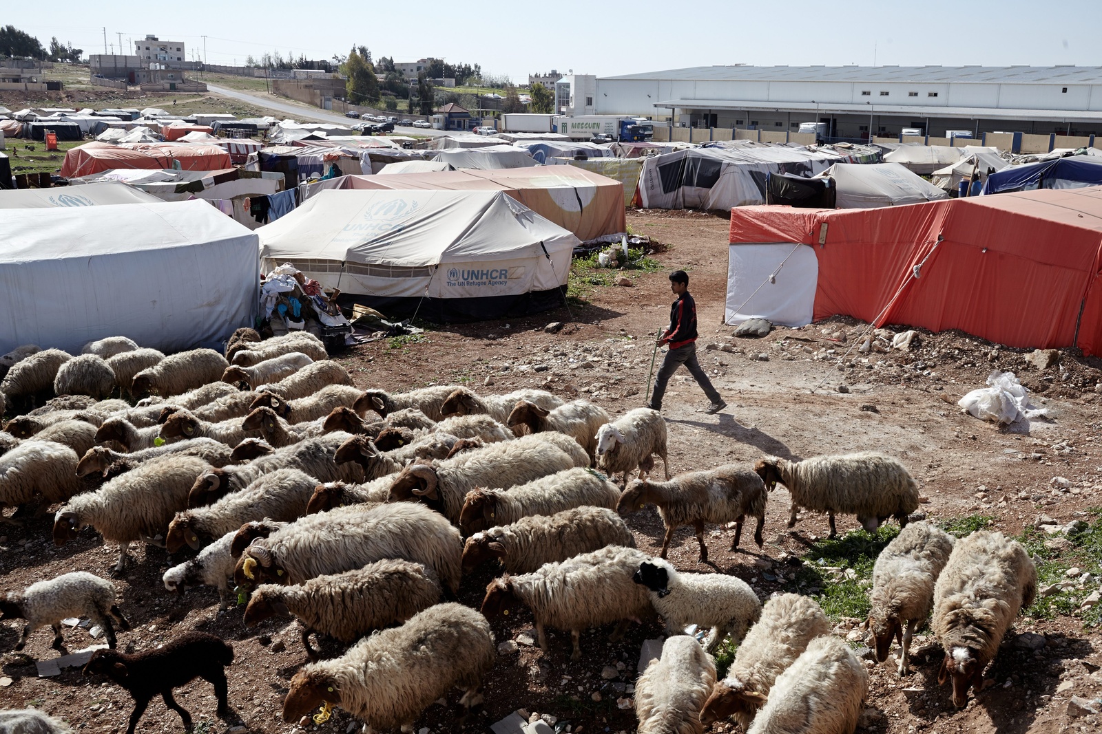 AMMAN, Jordan, April 24 (UNHCR) In a suburb of Amman, surrounded by piles of garbage and stray sheep, Jamal and his cousin Akram teach the Arabic alphabet to a small group of Syrian refugee children. The classroom is a small orange tent where the young pupils sit on the ground with their text books on their laps. A whiteboard dangles from a wall of the tent.