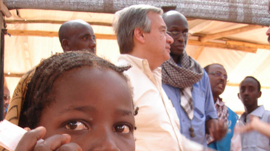 A new arrival from Somalia looks on as UNHCR chief António Guterres visits the Dollo Ado refugee transit centre in south-eastern Ethiopia.