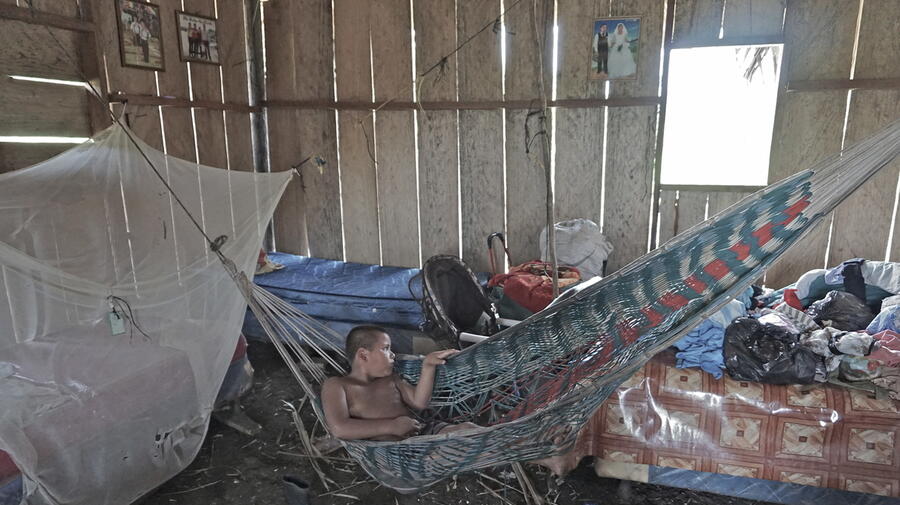 Six-year-old Edgar* lies in a hammock in his family's hurricane-damaged hut in Armenia, Belize.