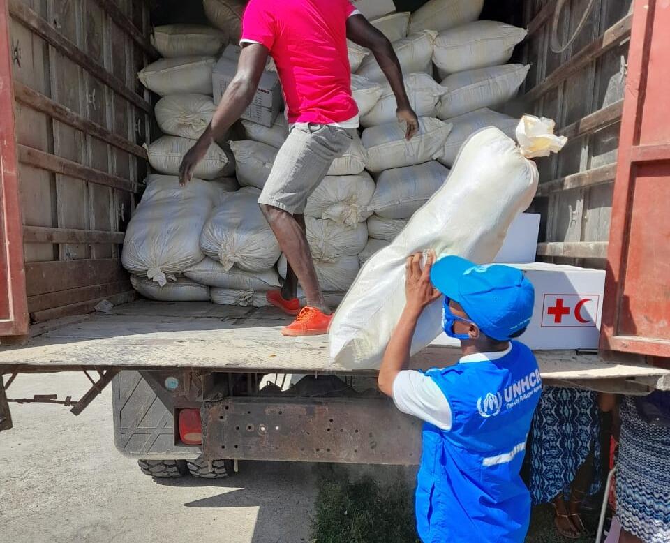 Together with the Haitian Red Cross, UNHCR delivered 12 containers filled with core relief items