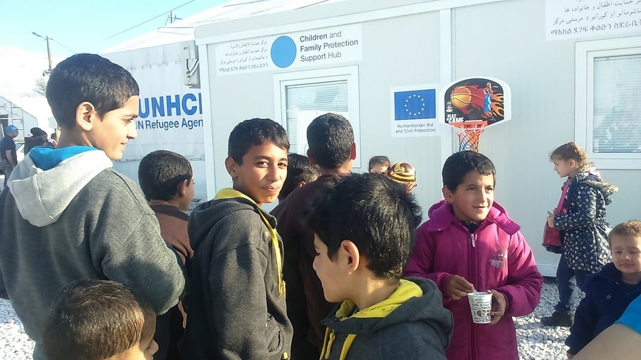 Children outside the Child and Family Support Hub at Vinojug reception centre in FYR Macedonia, where refugee families benefit from a range of services, including psycho-social support activities.