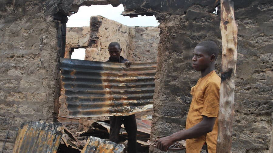 Two villagers in Benue state's Aguta district recover corrugated iron roofing from one of the many homes torched during attacks earlier this year.