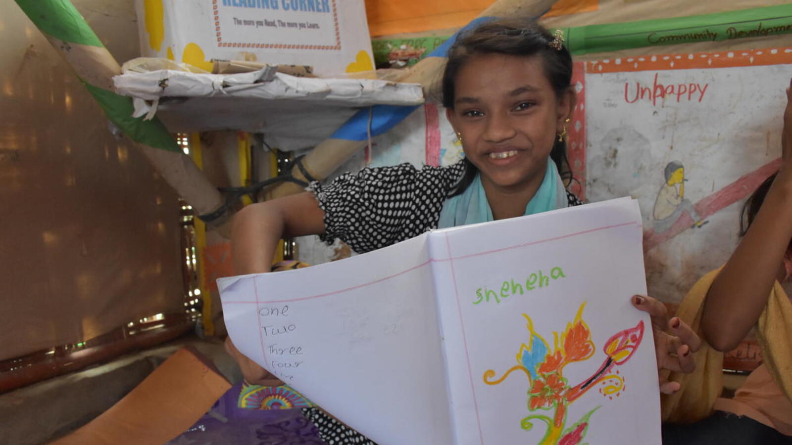 Shehana comes from a family where education has always been highly prized. Her brother, Mohammed Sharif, 17, studies at the same adolescent club with other boys in the afternoon, while one of her older sisters, 21-year-old Jannat Ara, teaches children aged four to five at a home-based learning centre, bringing along her own five-year-old daughter.