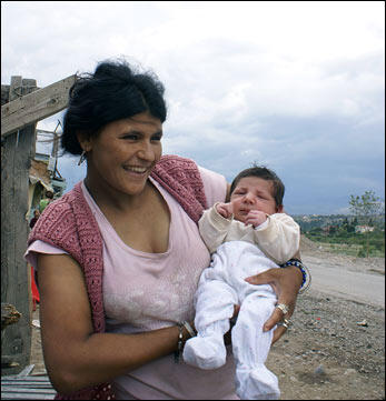 A portrait of a Roma woman displaced from Kosovo. She is holding her baby outside her home in Konik camp, Podgorica.