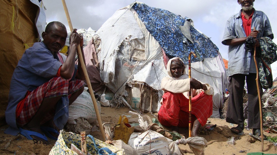 Displaced Somalis by their crude shelters outside Mogadishu.