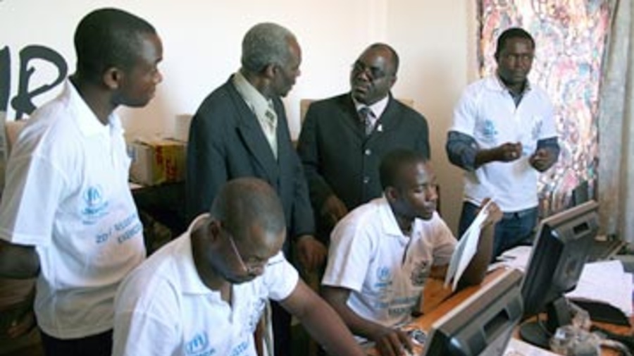 Malawi's Deputy Minister of Home Affairs Symon Vuwa Kaunda (standing, with glasses) watches UNHCR registration staff at work during a tour of Dzaleka Refugee Camp.
