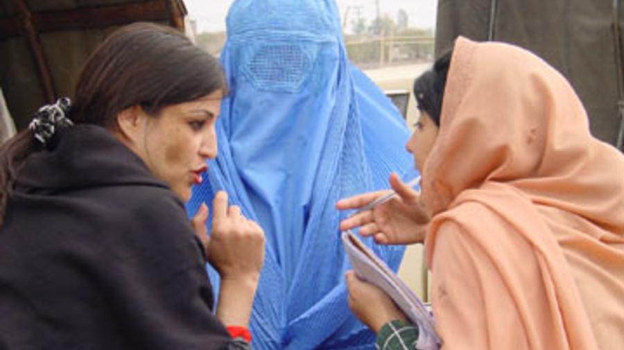 Two UNHCR trainees interviewing an Afghan woman about her intention to return to Afghanistan.