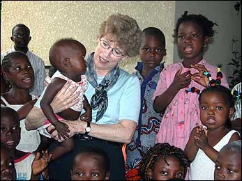 Deputy High Commissioner Mary Ann Wyrsch at Attoban transit centre in Riviera, Abidjan. Over 185 refugees have sought shelter here since their shantytowns were razed.