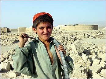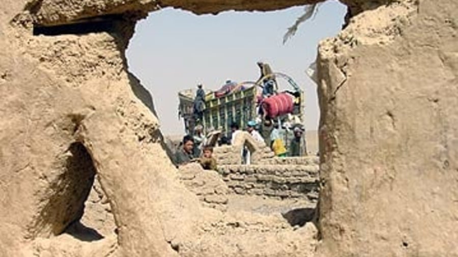 An Afghan boy stands amid the ruins of the mud houses dismantled as refugees leave Landi Karez camp at Chaman.