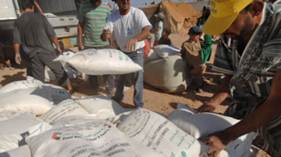 Trucks with aid from the United Arab Emirates being unloaded. The UAE has donated US$10 million to UNHCR for its Iraq crisis programmes.