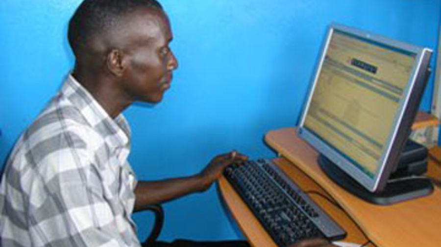 A course participant gets to grips with a computer. Returnees with basic computer skills are more likely to find a job in Liberia.