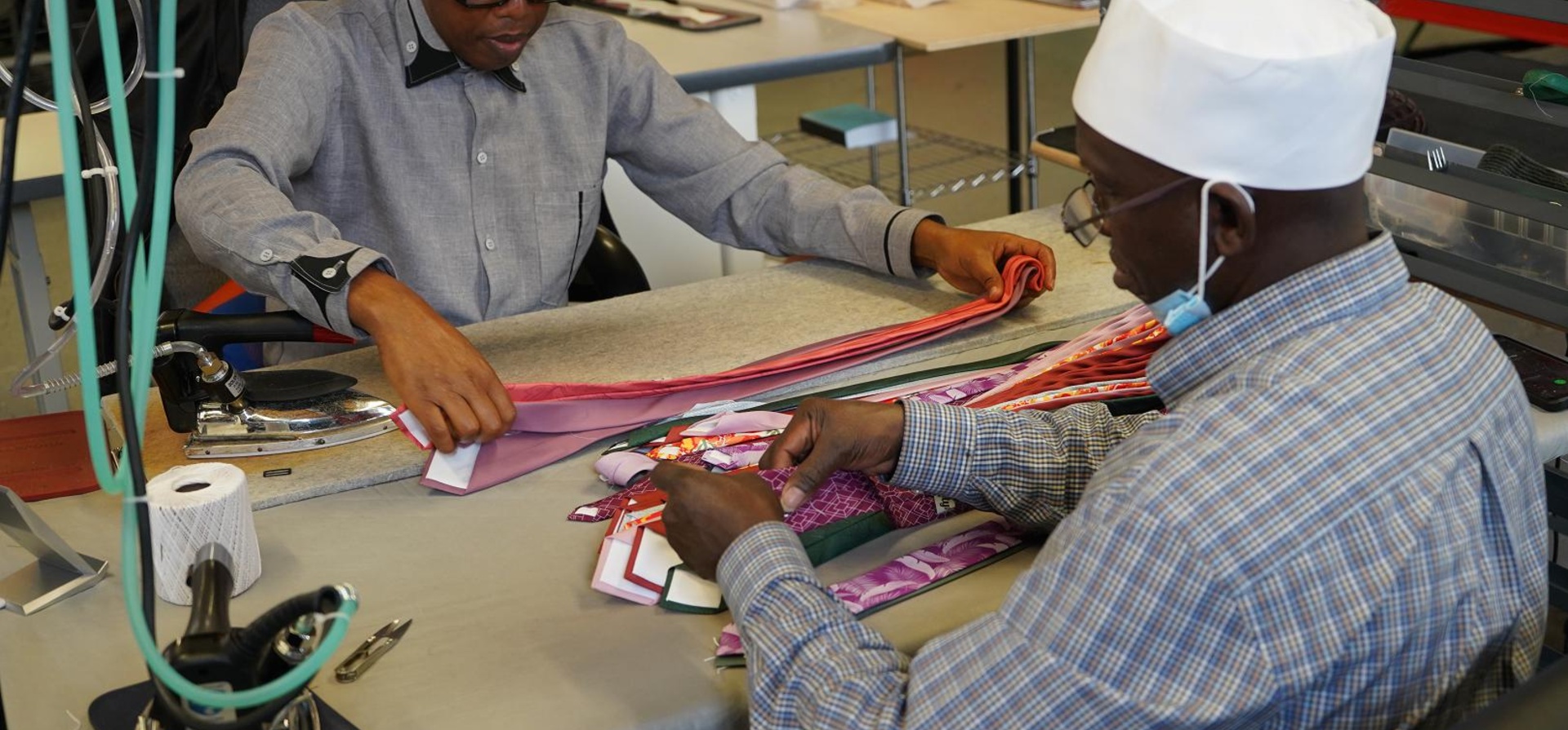 Refugiados reasentados trabajan en un pedido de corbatas a medida.